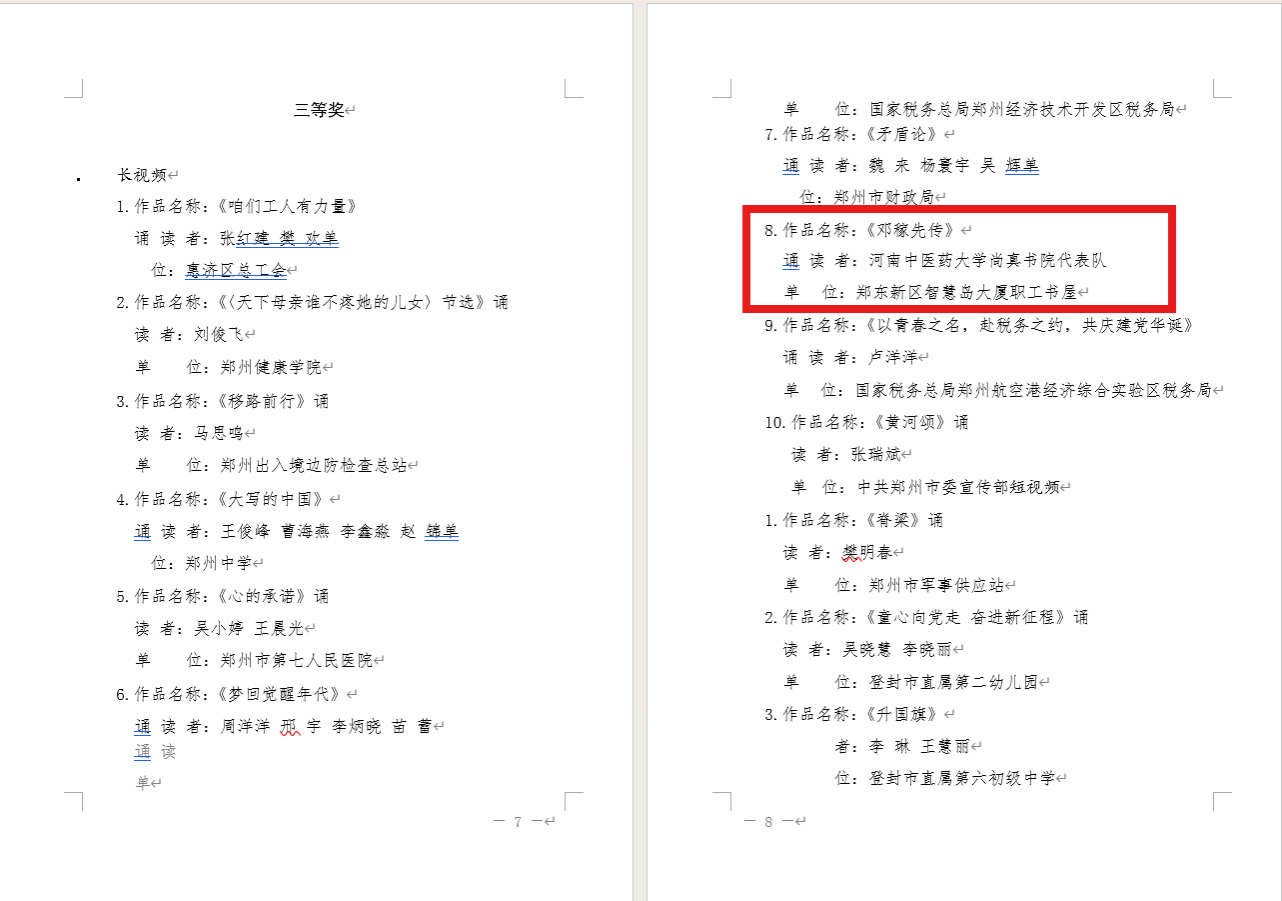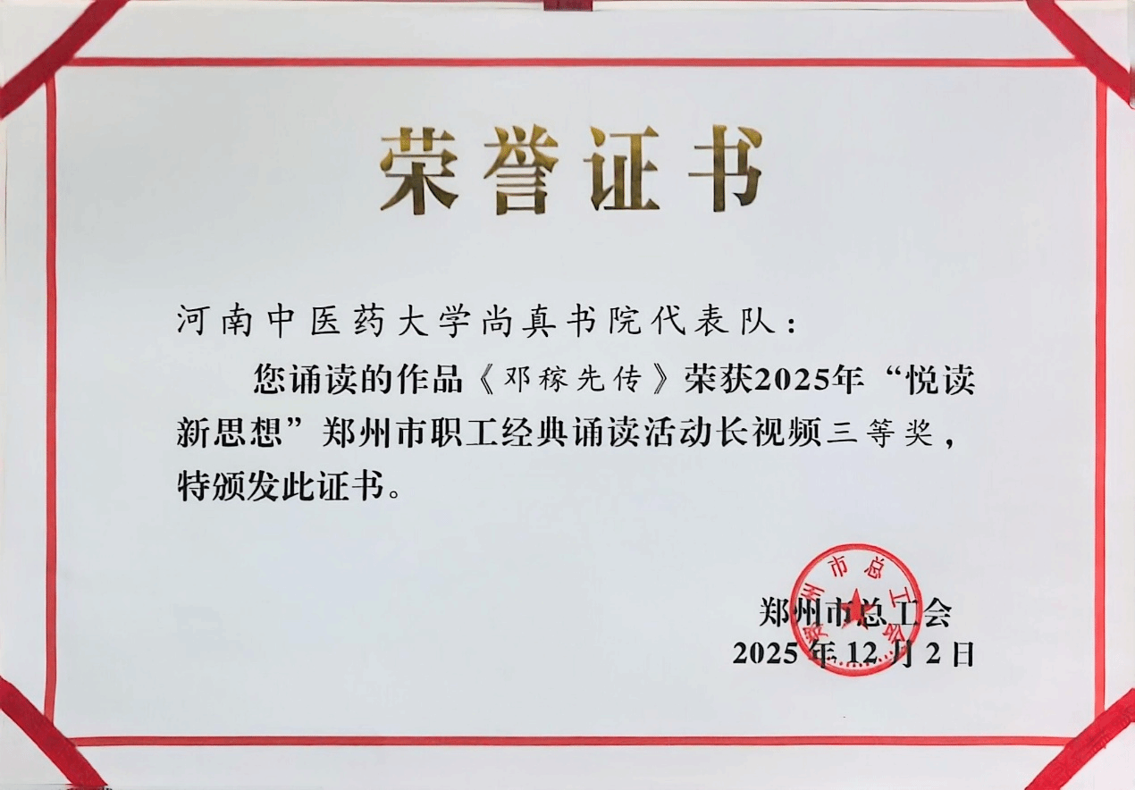 本网讯(文/田子萌 图/王洹)在刚刚落下帷幕的“悦读新思想”郑州市职工经典诵读活动中,河南中医药大学尚真书院表现优异,其原创作品《邓稼先传》凭借深刻的思想内涵与精湛的演绎,荣获长视频类别三等奖。该活动由郑州市总工会主办,旨在通过经典诵读形式,引领广大职工深入学习新思想,传承红色基因,弘扬爱国主义精神。这一荣誉不仅彰显了在新时代背景之下河南中医药大学优良的精神面貌,也体现了尚真书院丰硕的党建文化成果。